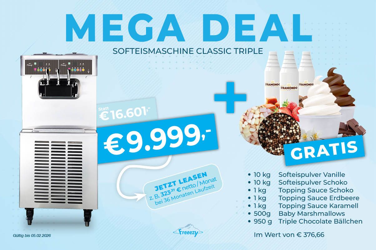 Bei Freeezy dreht sich alles um Softeis und Frozen Yogurt. Ob für Ihr Café, Ihre Eisdiele, Ihr Restaurant oder Ihren Freizeitbetrieb – wir liefern Ihnen die perfekte Technik, um Ihren Gästen cremiges Softeis oder erfrischenden Frozen Yogurt zu servieren. Von der kompakten Einstiegslösung bis zur leistungsstarken Profimaschine: Bei Freeezy finden Sie genau die Softeismaschine oder Frozen Yogurt Maschine, die zu Ihren Bedürfnissen passt.