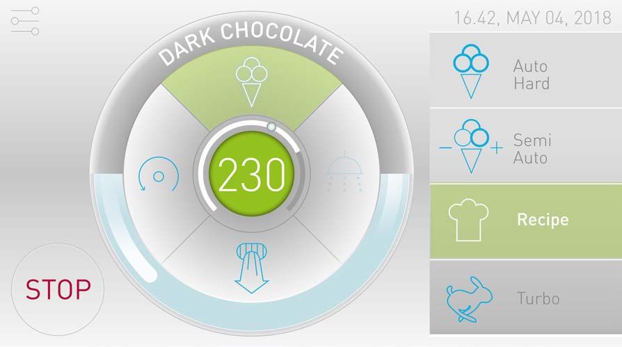 Für Produkte mit hohem Lufteinschlag gibt es eine Turbo-Rührung mit hoher Geschwindigkeit. Mit dem innovativen Rezeptmenü lassen sich viele verschiedene Rezepte einstellen und personalisieren, um für jedes Produkt die perfekten Gefrierkriterien festlegen zu können. Dank des innovativen Kühlzylinders mit Direktexpansion und des Edelstahlrührwerks mit mobilen Schabern wird eine besonders hohe Leistung erreicht, die Konsistenz bleibt dabei immer erhalten.