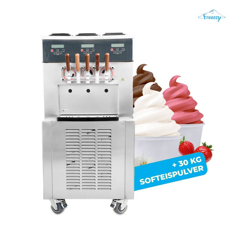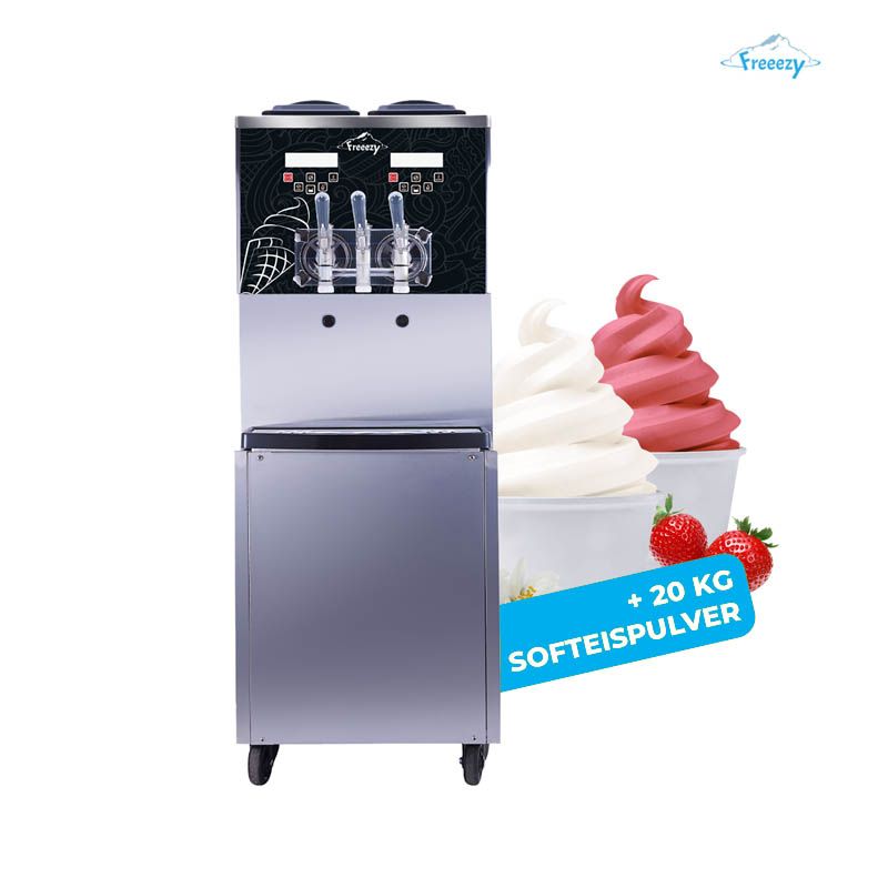 Erleben Sie Softeis auf höchstem Niveau mit unseren leistungsstarken Profi Softeismaschinen von Freeezy – jedes Modell wird mit hochwertigem Softeispulver geliefert, das Ihnen den Einstieg in die Softeisproduktion erleichtert und für extra cremigen Genuss sorgt.