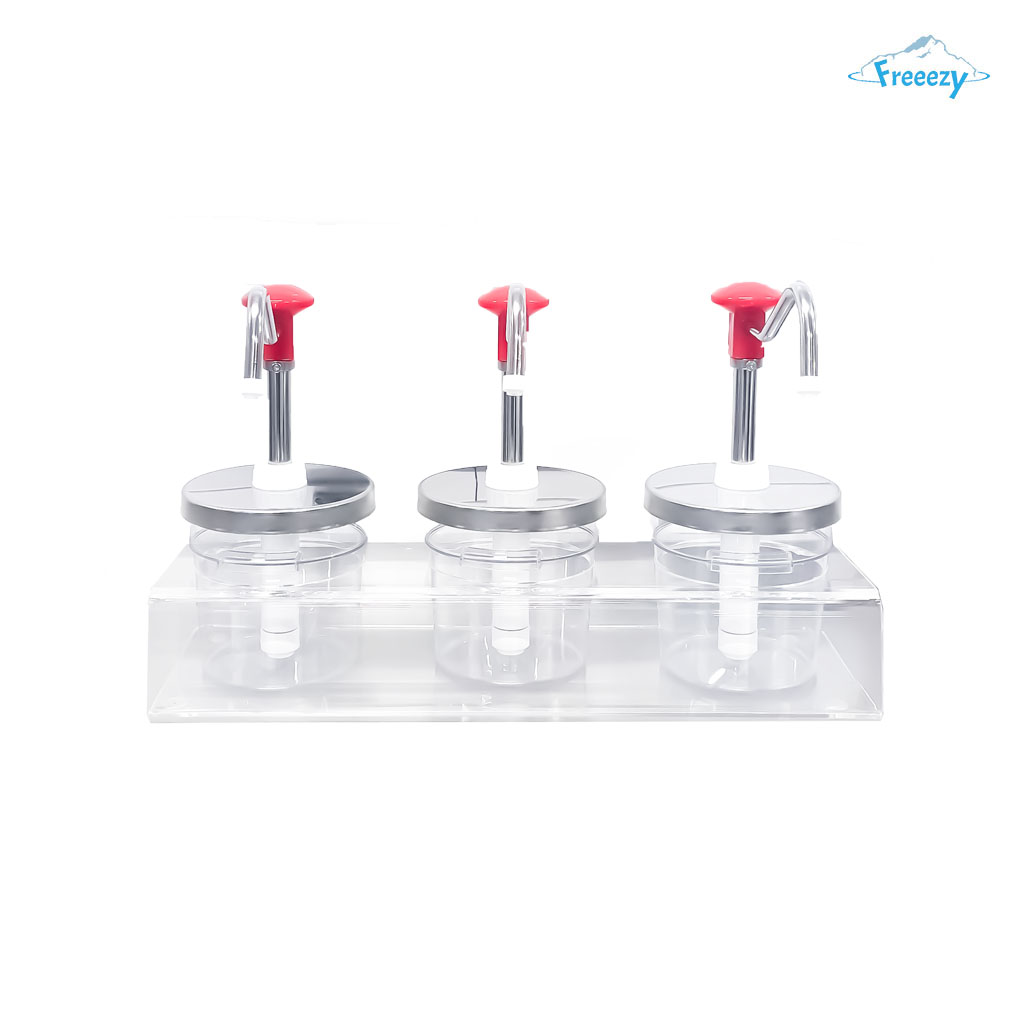 Mit der Freeezy Topping Pumpe bringen Sie Ordnung und Effizienz an Ihre Eis-, Dessert- oder Cremezubereitungsstation. Ausgestattet mit drei separaten Behältern, eignet sich dieses praktische Pumpsystem ideal für den Einsatz von cremigen Toppings, Saucen oder speziell für unsere beliebten Freezella Cremes.