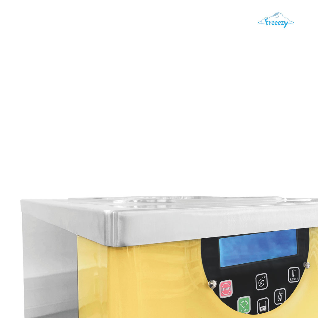 Mit der Freeezy Softeismaschine Softy Mini Deluxe gelb produzieren Sie im Handumdrehen bis zu 50 Liter köstliches Softeis pro Stunde. Dank ihres kompakten Tischdesigns passt sie perfekt in kleine Gastronomiebetriebe und ist trotzdem leistungsstark genug, um selbst größere Nachfrage zu bedienen.