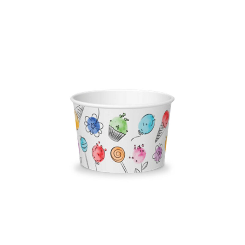 Die bunten Eisbecher vom italienischen Hersteller Poloplast springen sofort ins Auge. Sie sind aus Papier oder Pappe hergestellt und innen beschichtet. Die Becher sind verschieden groß und mit unterschiedlichen Aufdrucken erhältlich.